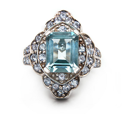 Majesty and fantasy collide in this ethereally romantic piece, featuring 2 shades of sparkling ice blue in a vintage-styled, sterling silver design. A single 3-carat, emerald-cut ice blue topaz is proudly crowned by over a carat of 32 round brilliant-cut tanzanite stones in all their sparkling cornflower blue glory. Gleaming bright sterling silver and ice blue is such a classic color combination, and it's impossible not to think of ancient royal times when you look at this piece: there's something about the way these dusky blue stones cradle this sky blue, emerald-cut gem that makes you long for the days of King Arthur, magical swords and more dignified times. Let yourself be swept away by one of our most unmistakably regal creations: Camelot awaits.
