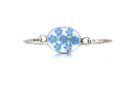 Get lucky with this exquisite floral medallion charm bracelet, featuring 7 lucky miniature real elderflowers "frozen" in lacquer. This clever design offers the perfect cross between a bangle and a cuff: a dainty band of fully round sterling silver balances this pretty oval floral charm, creating a graceful, modern piece for those who prefer a lighter metal touch encircling the wrist. Who needs a rabbit's foot?